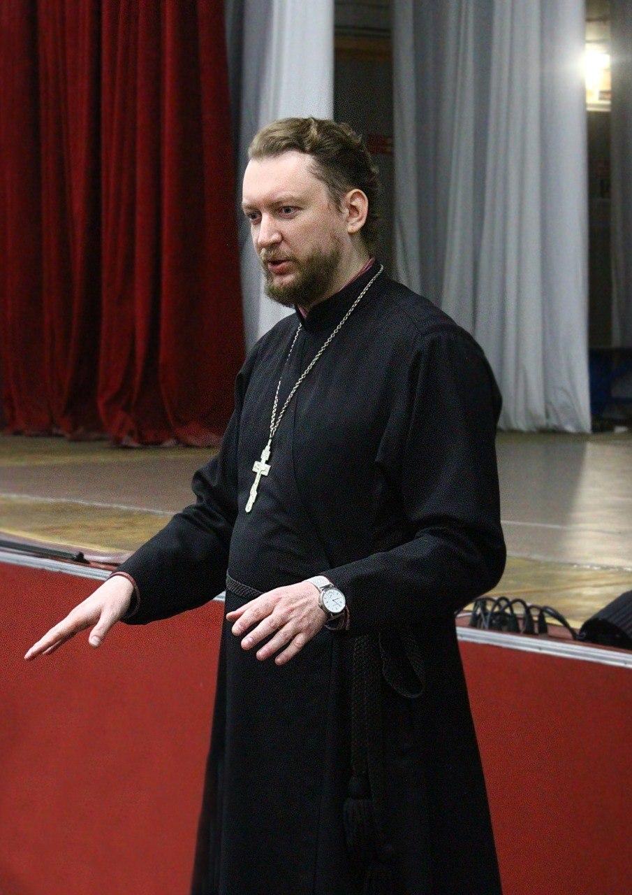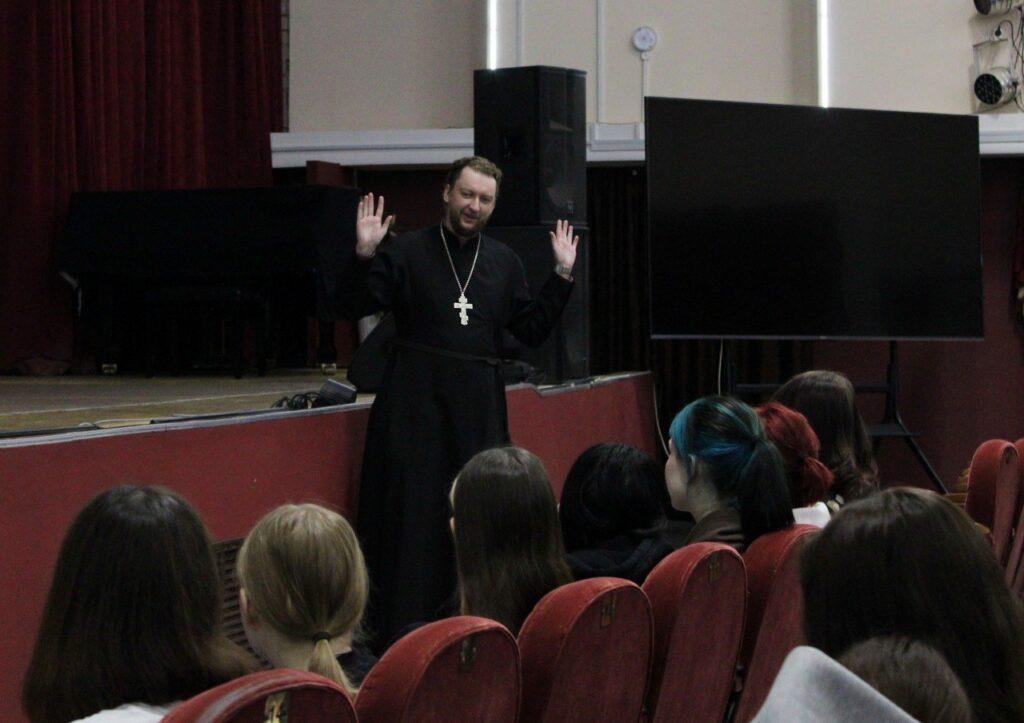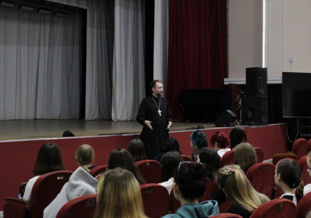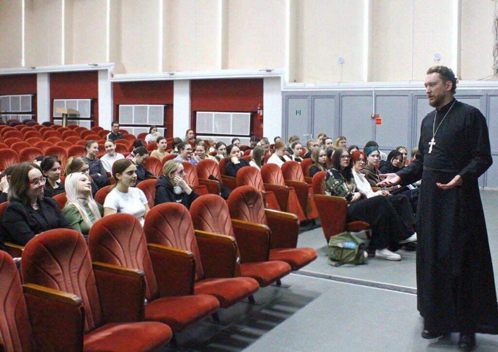 Со студентами пообщался специалист по взаимодействию с образовательными организациями Центра подготовки церковных специалистов (Вятское Духовное училище) священник Алексей Шишкин